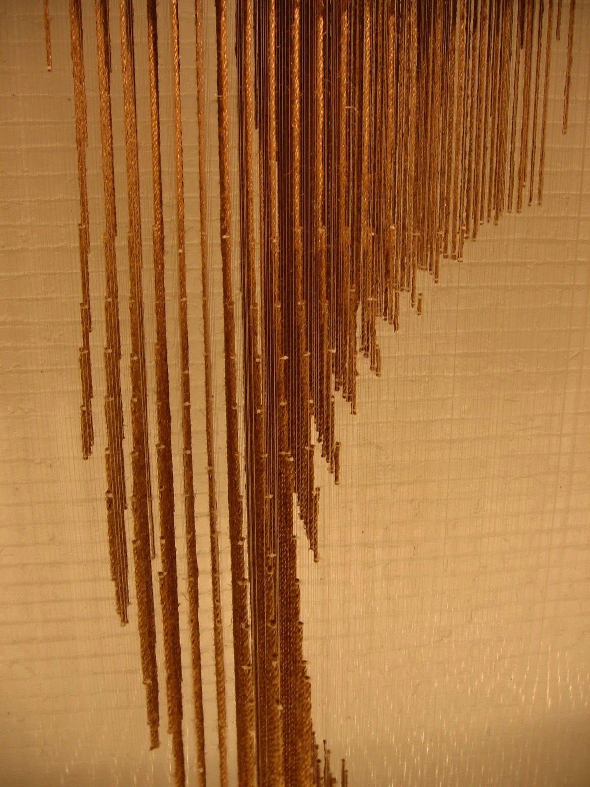 This commissioned sculpture, designed and fabricated by Taylor and Miller, is 3’x3’ in width, and is made up of a network of 800 vertically oriented 32’ long linear elements. The linear elements are a composition of monofilament and manila roap, knotted together at each material joint. In order to design and fabricate the piece, a computer model of a solid ‘sculpted’ object is intersected with a grid of vertical lines; where these objects intersect determine the location of the larger linear elements that render the solid object when hung closely together.
