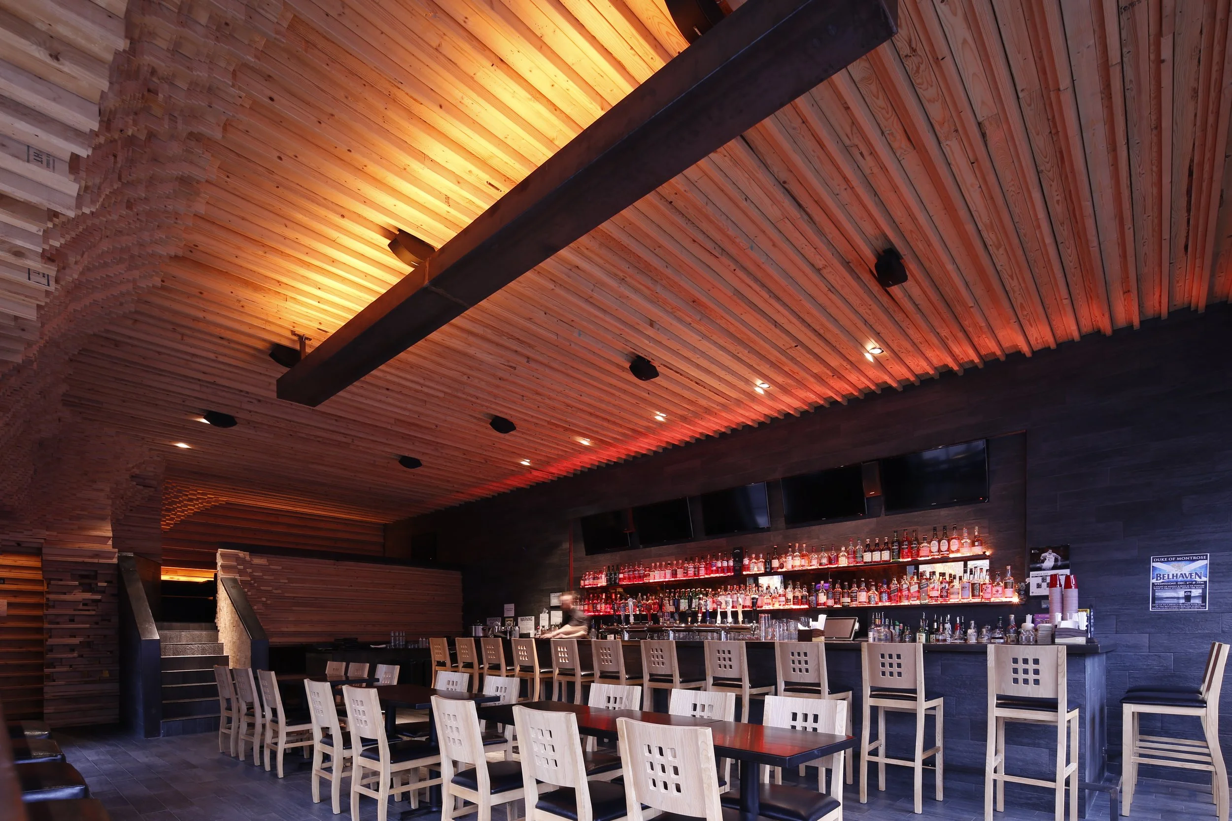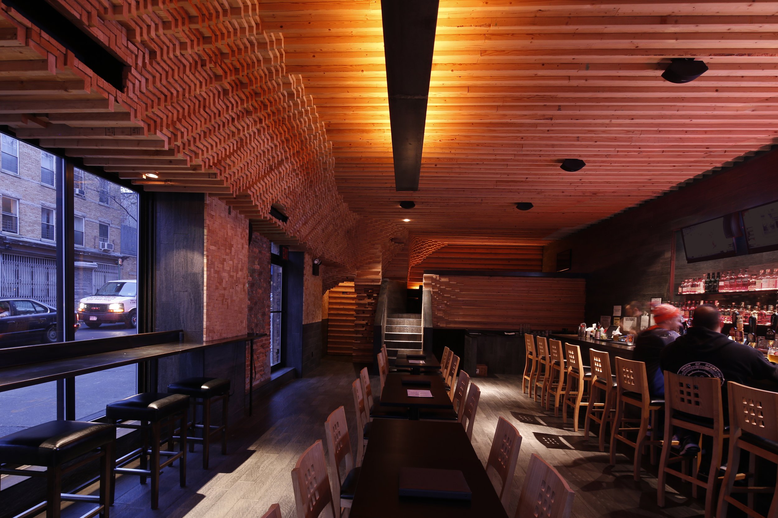 The Duke of Montrose is a whiskey bar in Brooklyn that was designed by Taylor and Miller and built by one of the bar’s owners, Steve Owen. As a built work, the project is based on the idea of taking what is typically a two-dimensional pattern – the herringbone pattern – and translating it into three-dimensional space and form. The herringbone pattern came with a slight nod to the pattern used on the basketball court of the Brooklyn Nets, whose Barclays Center is 2 blocks away from the bar. The individual units of the pattern are basic pine 2x4s. Pulled out of the constraints of a 2d surface pattern, the 2x4s begin to create continuous curvature out of once perpendicular and flat surfaces.