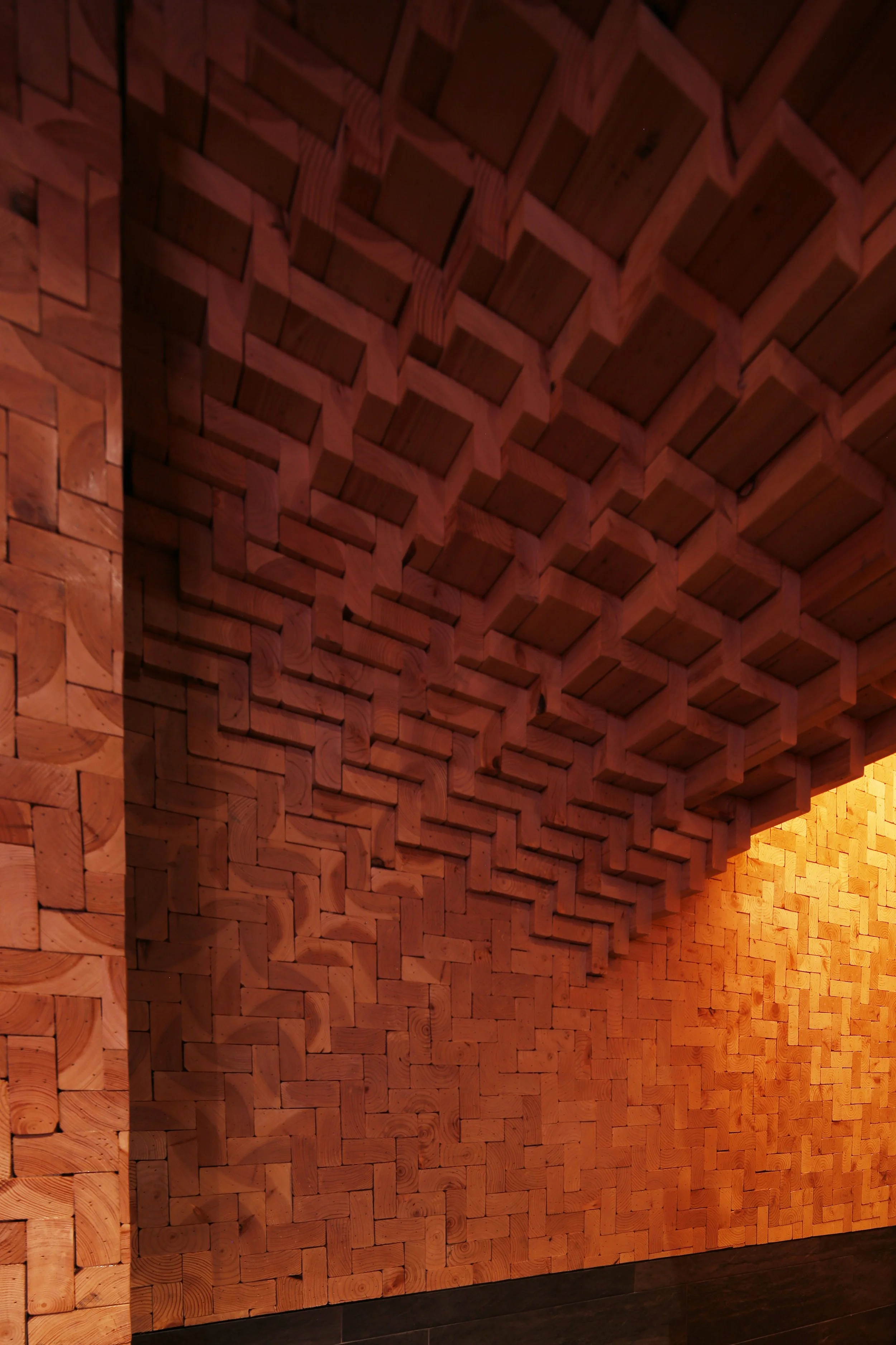 The construction of the project was also used as an exploration of data-driven architectural representation between designer and builder/owner, where the 2x4 units that make up the topological curves where noted as simple numbers that dictated how far out of the wall surface the units came, with a second notation that described where in the herringbone pattern the units ‘reset’ themselves in relationship to the ceiling datum line. The system was designed to allow for adjustments to be made on site; without input from the design team. The result (we think) is an interesting combination of system and improvisation.