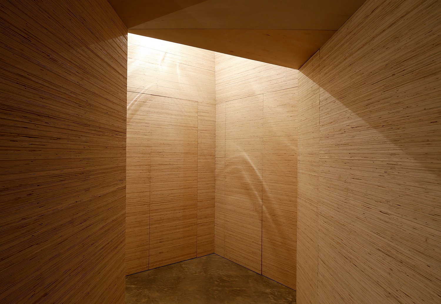 This residence in Western Massachusetts maintains a dualistic relationship with the lake against which it is nestled. When seen from the street, the house is abstract in form, showing no aperture or puncture. As one steps down the walking path and towards the lake, however, the house opens itself up. A singular stacked timber wall, serving as both retaining wall for the landscape in which the home is embedded and as a primary enclosure for the home, becomes punctured intensely as the home turns towards the lake. A series of sleeves act as spatial leaks, breaking through the timber and allowing the interior spaces to reach out to the lake in the form of very specific views.