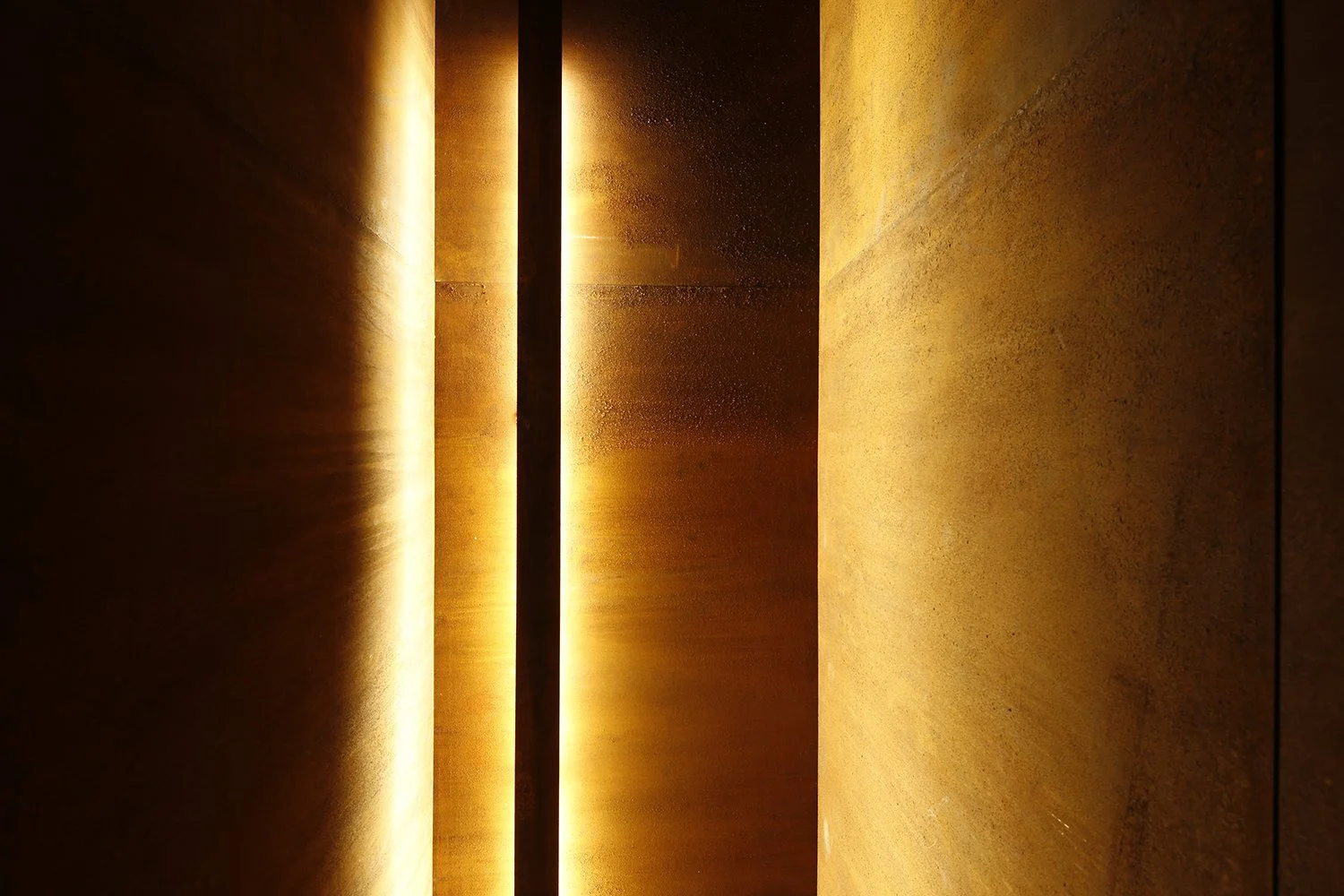 As one moves through one of the sleeves and into the interior of the home, two different spatial orientations are introduced - one horizontal orientation that is defined by the sleeves looking out to the lake and a vertical orientation that is defined by the sleeves looking up to the sky. Each of these types of spaces is defined differently in their materiality. In the case of the spaces oriented horizontally, they are characterized by neutral tone and materiality. In the case of the spaces oriented vertically, they are characterized by their view of the sky through a skylight aperture and intense changes in material; the entry vestibule with stacked plywood, the kitchen with hot-rolled steel, and the stair with rusted steel. Moving through the home, these vertical spaces provide a kind of cinematic 'hard cut' that interrupts the modernist notion of continuous flowing space as they present themselves between the horizontal spaces of more neutral character.