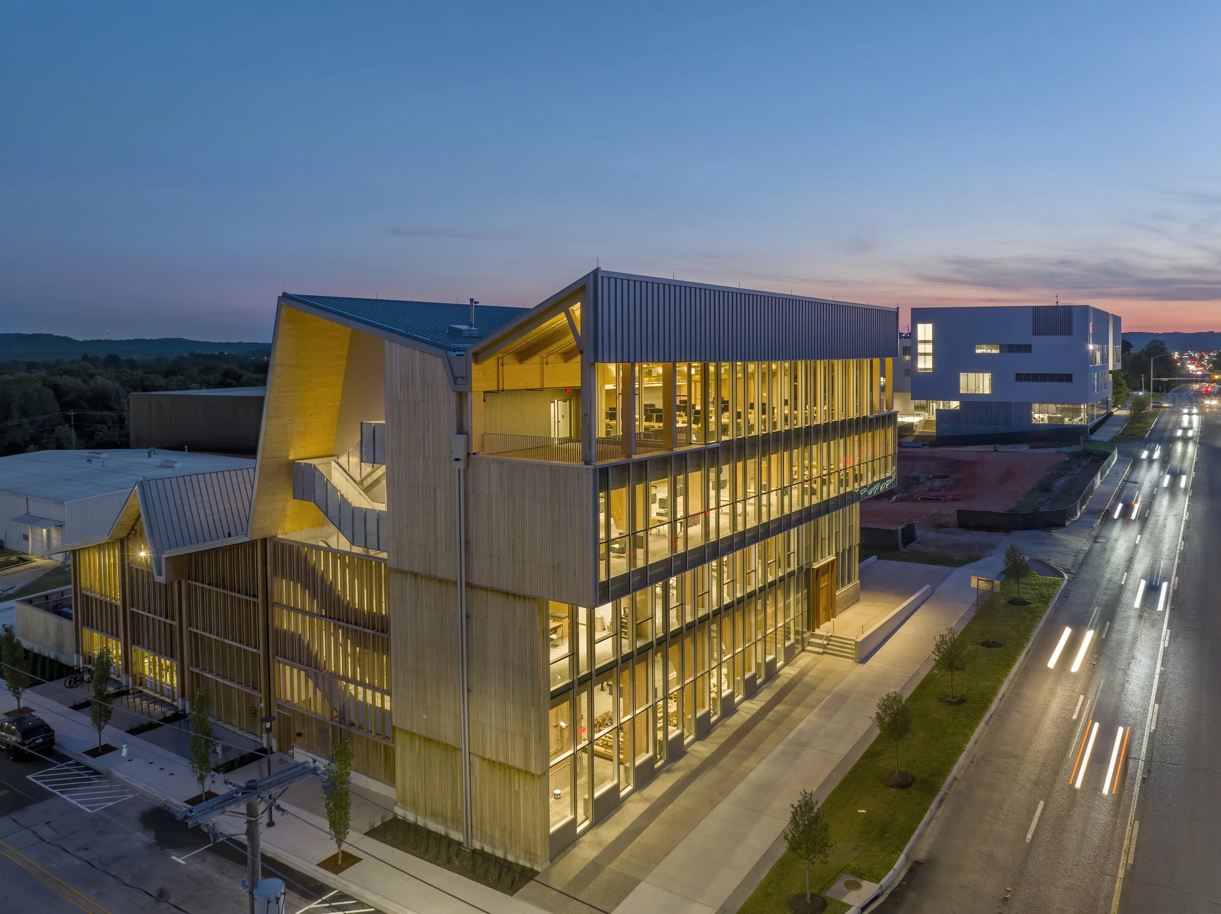 Responding to the local climate, we propose a Canopy of Light and Air - a cascading roof with glulam rain-water gutters - covering the open-air yard, the Fabrication Shop and connecting all the layered teaching spaces of this new facility, upper critique spaces form educational and social vantage points. The new building sits on the corner of Martin Luther King Junior Boulevard and Lt. Col. Leroy Pond Avenue, acting as a beacon to the city of Fayetteville.